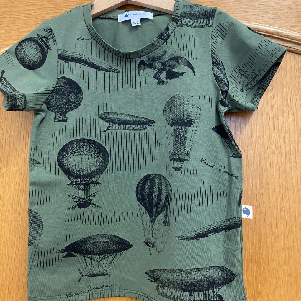 Motiv inspirovaný Zemanovými létajícími stroji z filmu Ukradená vzducholoď, vytištěný černým sítotiskem na khaki úplet. Úplet je velice příjemný na nošení a v té nejvyšší kvalitě. Jedná se o digitálně potištěný materiál, barvy jsou výrazné, neopírají se.
