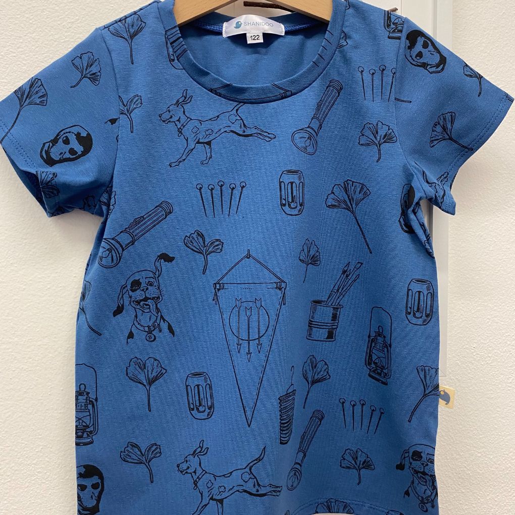 Chlapecké triko RYCHLÉ ŠÍPY s krátkým rukávem. Jemný černý potisk na tmavě modrém podkladu s motivy v duchu foglarovských dobrodružství– ježek v kleci, pes Bublina, lucerna, vlajka se třemi šípy, maska a listy jinanu.