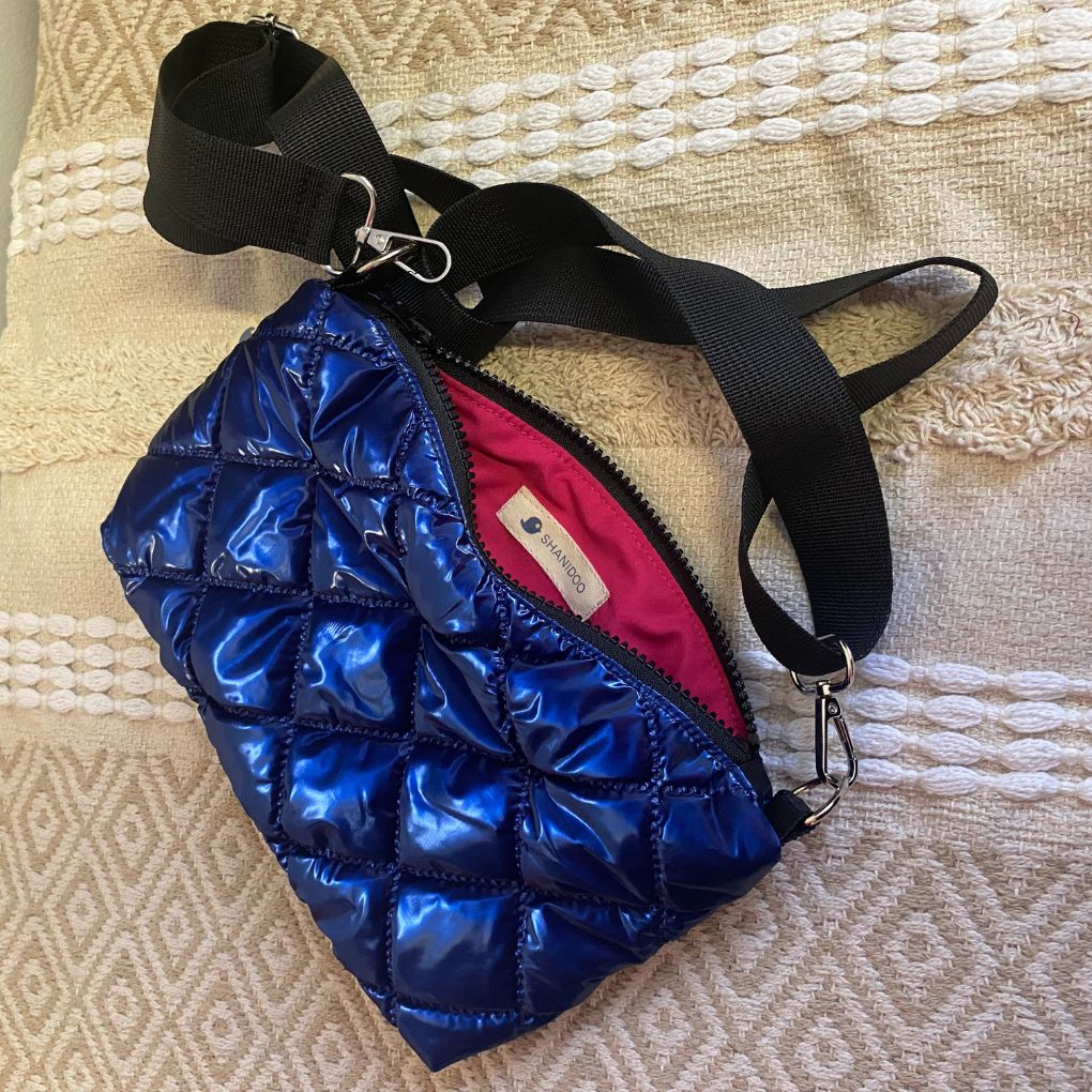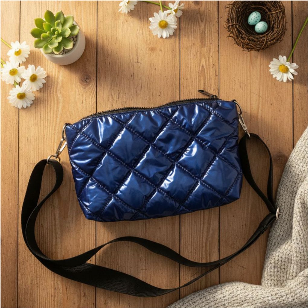 Kabelka Puffy Blue je stylový a originální doplněk, který okouzlí na první pohled svým lesklým metalickým povrchem a nadýchaným „prošíváním“. Elegantní tmavě modrá barva působí luxusně a zároveň univerzálně — snadno ji sladíte jak se sportovní bundou, tak s elegantním kabátem.