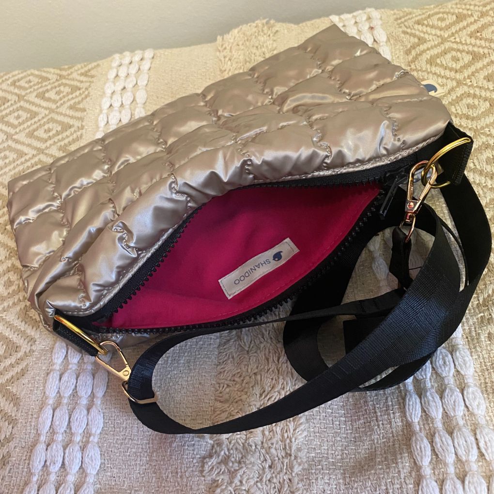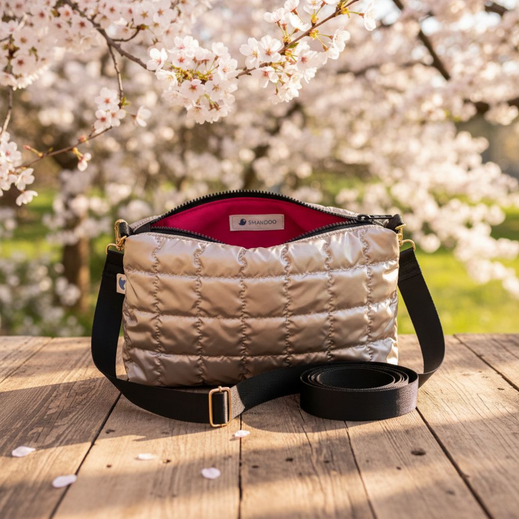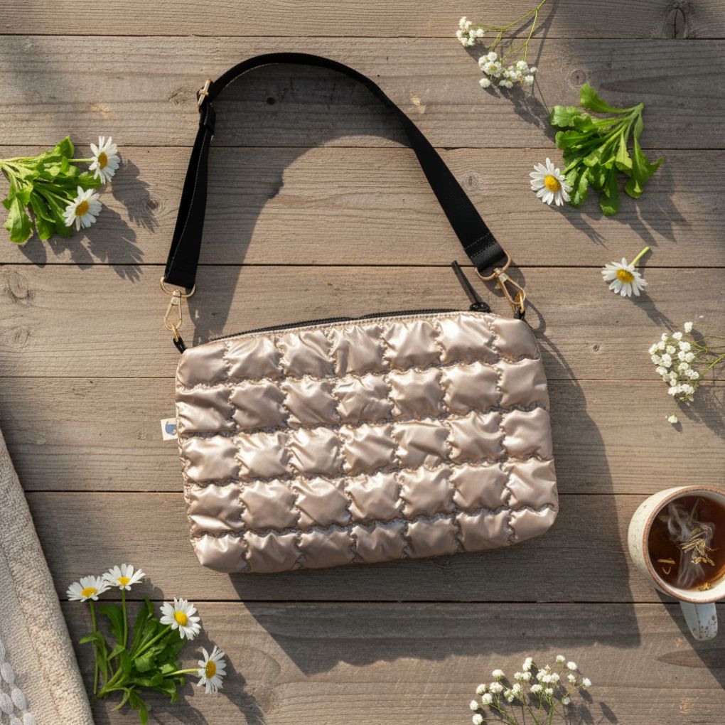 Kabelka Puffy Gold je stylový a originální doplněk, který okouzlí na první pohled svým lesklým metalickým povrchem a nadýchaným „prošíváním“. Elegantní zlatavá barva působí luxusně a zároveň univerzálně — snadno ji sladíte jak se sportovní bundou, tak s elegantním kabátem.