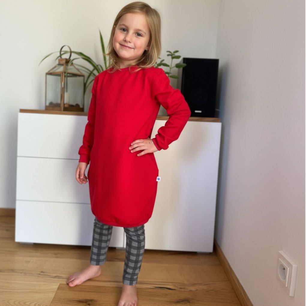 Jasně červené mikinové šaty CHERRY. Šaty mají kapsy a jsou ušité z kvalitní měkké teplákoviny.