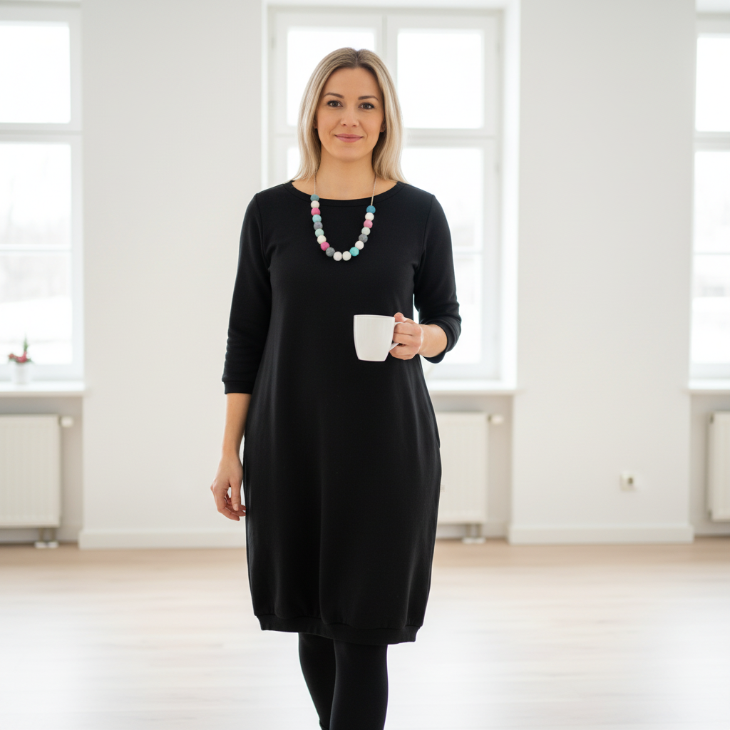 Hravé mikinové šaty v černém univerzálním odstínu. Šaty mají kapsy a jsou ušité z kvalitní měkké teplákoviny. Hravost můžete šatům dodat našimi korály.