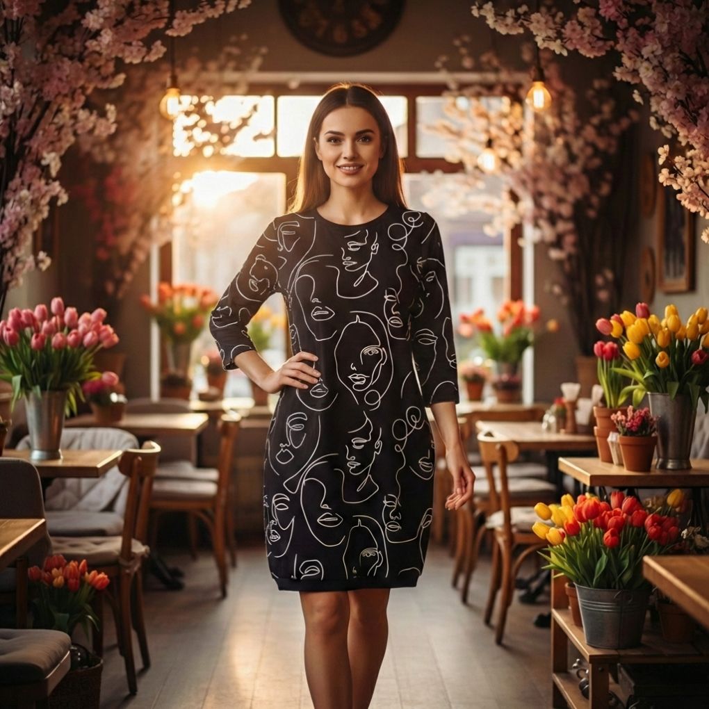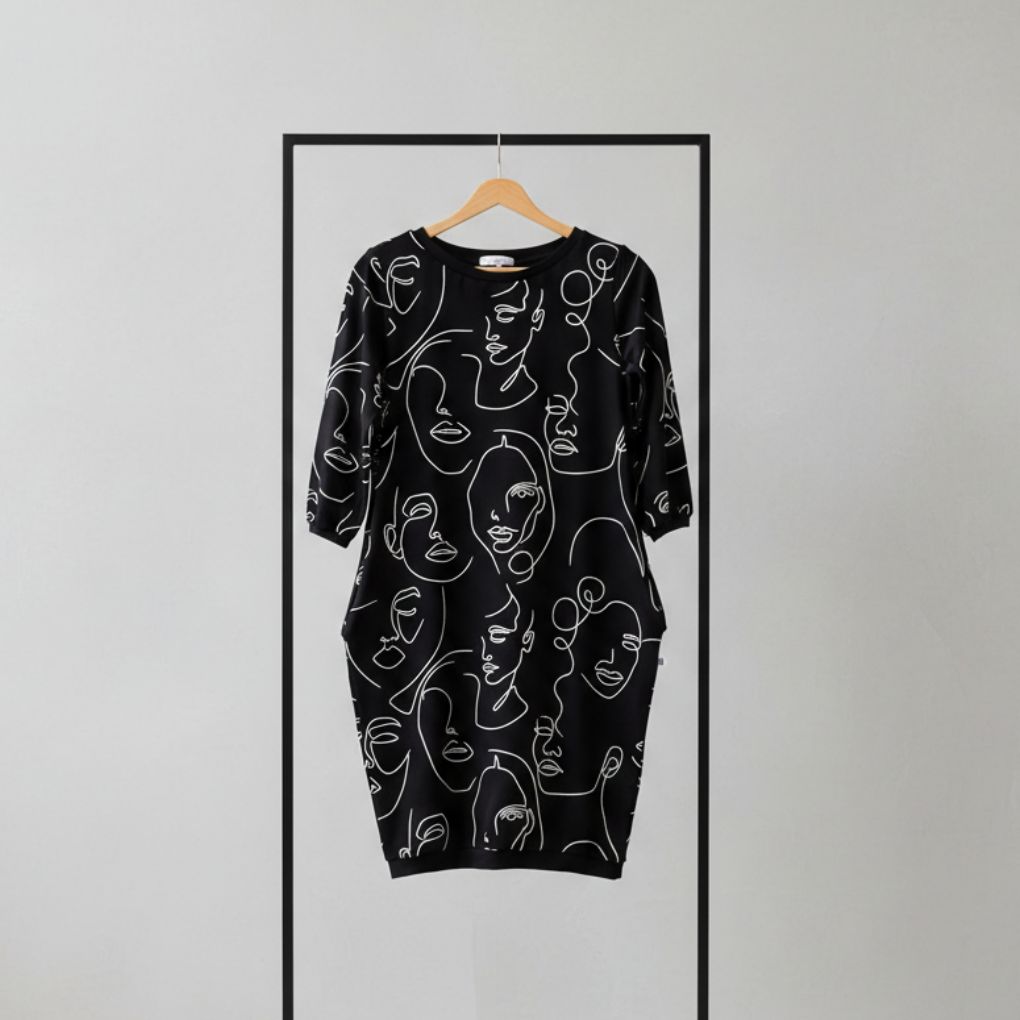 - Šaty z pevnějšího úpletu s originálním line-art vzorem tváří.