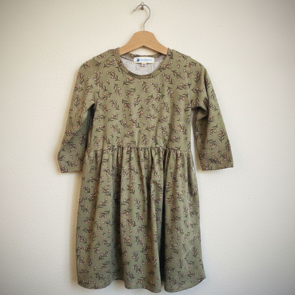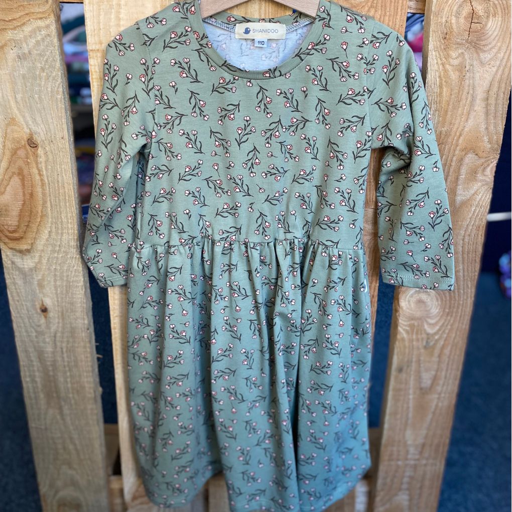 Zelený základ doplňují drobné kvítky – nadčasový vzor, který působí roztomile, ale zároveň elegantně. Šatičky mají dlouhý rukáv a jemně řasenou sukýnku, takže padnou krásně každé malé slečně.