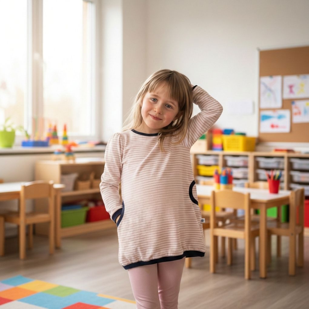 Střih je mírně prodloužený, takže skvěle sedí jak k legínám, tak k punčocháčkům. Díky měkkému, příjemnému úpletu jsou šaty ideální do školky nebo na volný čas. Každý detail byl šitý s ohledem na pohodlí a volnost pohybu.