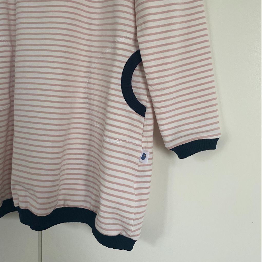 Kombinace tmavě modré a jemných proužků působí svěže a hravě, zatímco tmavě lemované kapsy dodávají celému kousku styl i praktičnost.
