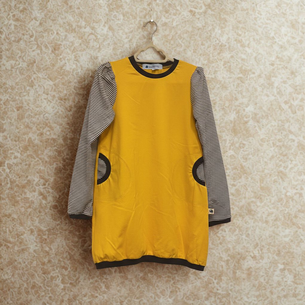 Kombinace tmavě modrých proužků a žluté působí svěže a hravě, zatímco tmavě lemované kapsy dodávají celému kousku styl i praktičnost.