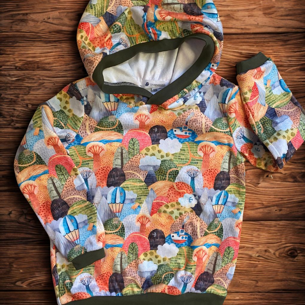 Materiál Fleece antipilling, který je příjemný na dotek a ideální do chladnějšího počasí. Originální vzor plný barevných domků, kopečků, stromů a horkovzdušných balónů vytváří hravý svět plný fantazie a dobrodružství – přesně pro děti, které milují objevování.
