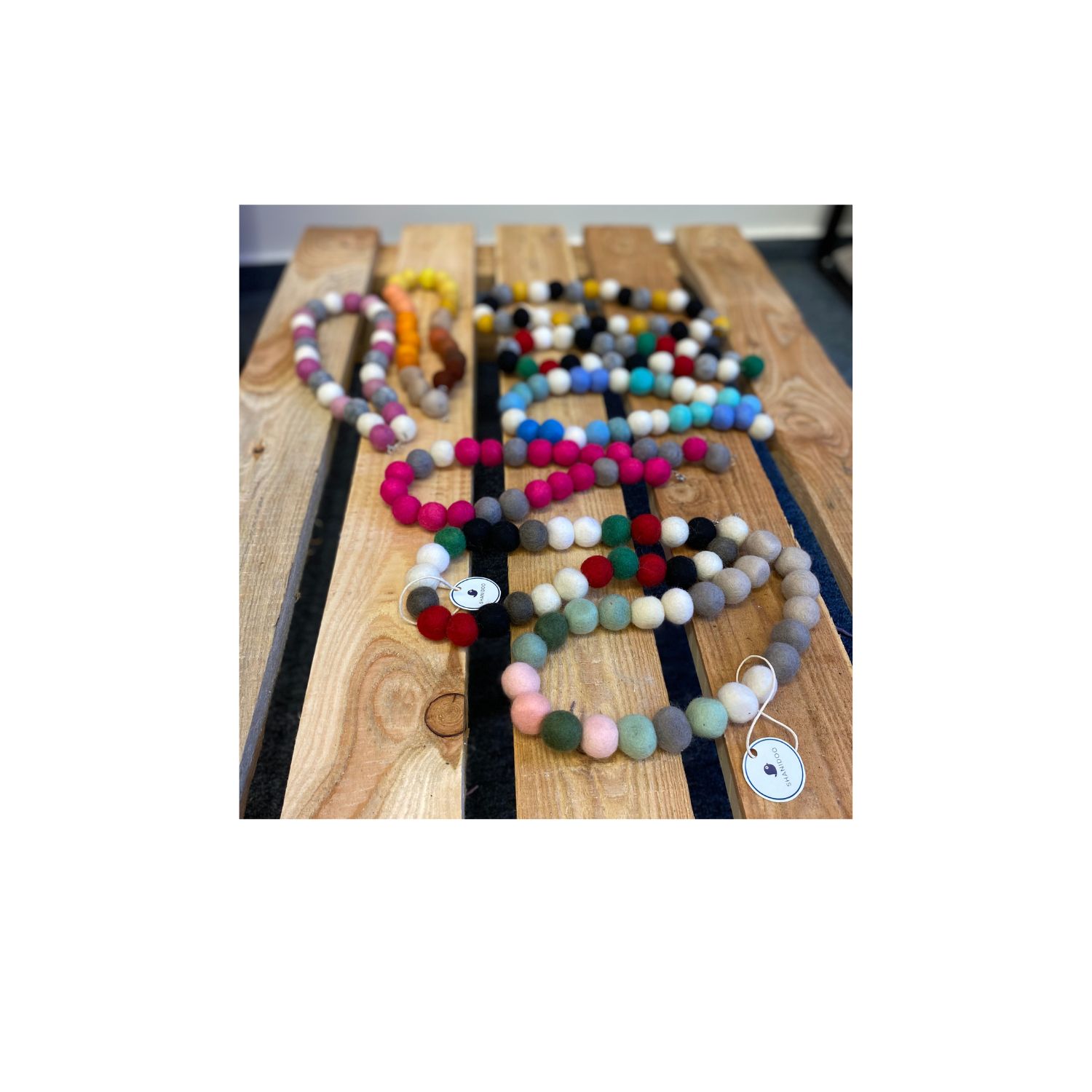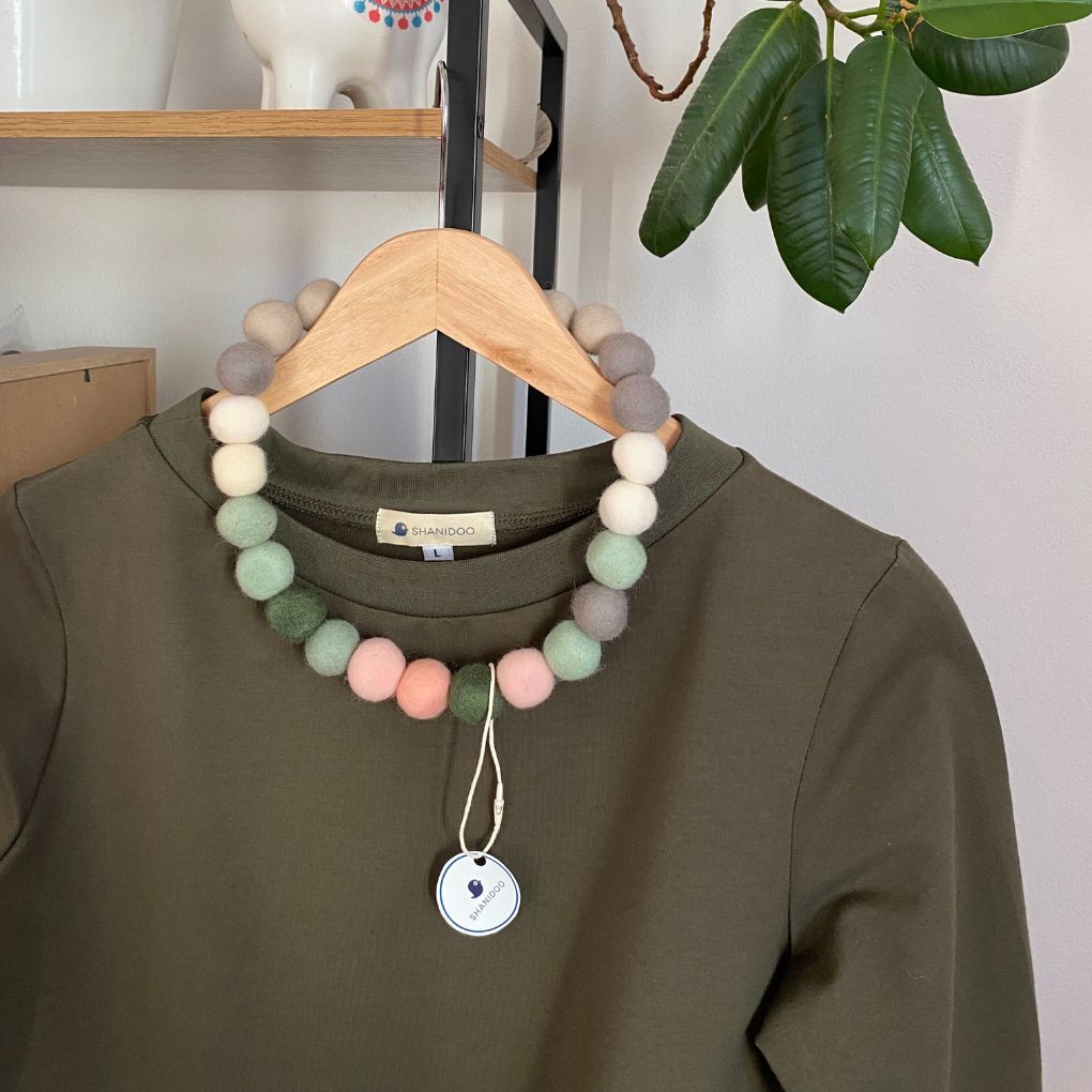 Tyto ručně vyráběné plstěné korále o celkové délce cca 58 cm a průměru jednotlivých korálků 1,8 cm jsou lehké, příjemné na nošení a dokonale doplní naše jednobarevné mikinové šaty, trička či jednoduché outfity pro každý den.