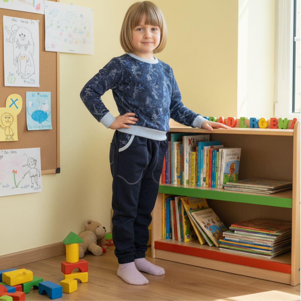 Mikina i tepláky mají praktické kapsy na tajné poklady, pružné náplety a pohodlný kulatý výstřih. Celá souprava je měkká, prodyšná a ideální na každodenní nošení – do školky, na hřiště i na výlety.